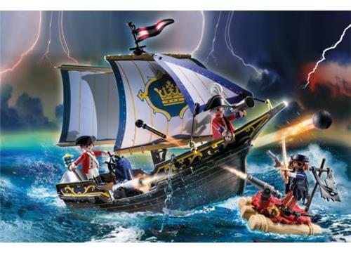 | Verpakkingsinhoud | De speelset omvat een zeilboot en een vlot met kanon, drie PLAYMOBIL-figuren, een kist, een schatkaart, een sextant en nog veel meer accessoires. De voetklemmen zorgen ervoor dat de figuren stevig op het dek en het vlot staan. Het zeilschip kan drijven en kan worden uitgebreid met een RC-onderwatermotor (9853). |
