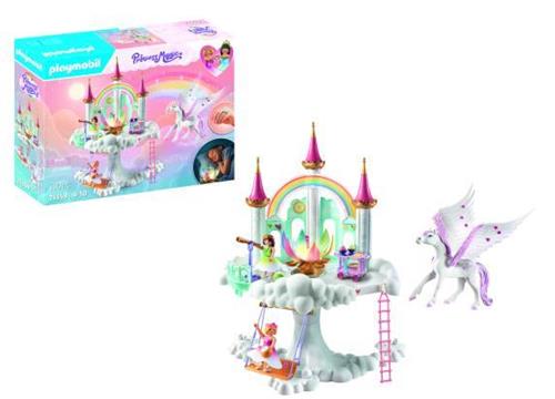Hoog boven in de wollige wolken bevindt zich het hemelshuis van de regenboogprincessen. Behoudend van de regenboog en het licht van de magische stralende regenboogbloesem* (uitneembaar), genieten ze van het leven. Bijzondere hoogtepunten zijn onder andere de aanwezigheid van Pegasus, een hemelschommel en prinsessen met verenrokken om te veranderen. Dit speelgoed bevat twee PLAYMOBIL figuren, een Pegasus met beweegbare vleugels, een regenboogkasteel met schommel, gloeiende regenboombloem, stickervel en vele andere magische extra's voor fantasierijke rollenspellen. Combineer deze set met de Babykamer in de Wolken (71360) en de Kleedkamer in de Wolken (71408) om een grote kleurrijke regenboogscène te creëren.