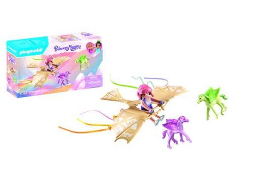 Lieflijk ontworpen prinsessen speelgoed met een PLAYMOBIL-figuur, twee Pegasus veulens, een vliegende zweefvlieger en andere leuke extra's voor creatief rollenspel. Magische vlieglessen: de figuur kan de zweefvlieger met beide handen vastpakken. Zes regenbooglinten kunnen met behulp van bloemen aan de achtervleugel worden bevestigd. Een geweldig cadeau of souvenir voor creatieve kinderen van 4 jaar en ouder.