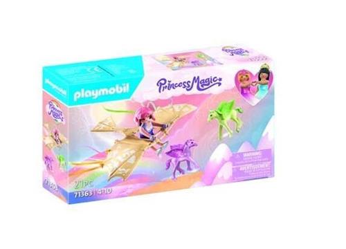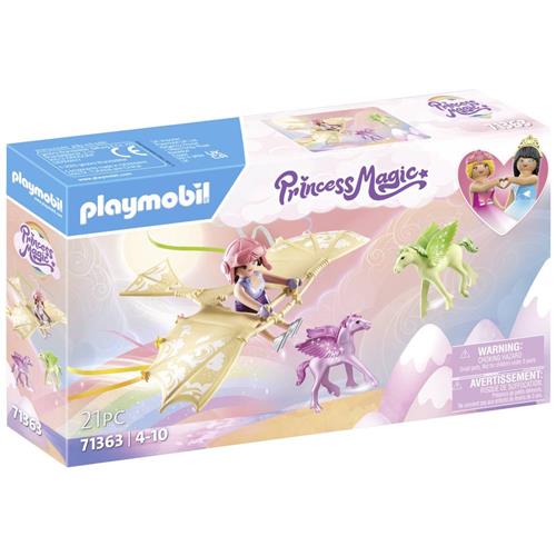 De regenboogprinses vliegt met haar Pegasus veulens door de lucht om haar vliegkunsten te oefenen. Maak een mooie reis naar de regenboog met de schattige Pegasus veulens in de wolken van PLAYMOBIL. Dankzij haar behendige wolkenvliegtuig kan de prinses haar lievelingen te allen tijde begeleiden. Zij aan zij suist het trio door de wolken. Betoverende personages, magische wezens en fantastische gebouwen nemen kinderen mee op een fantastisch speelavontuur.