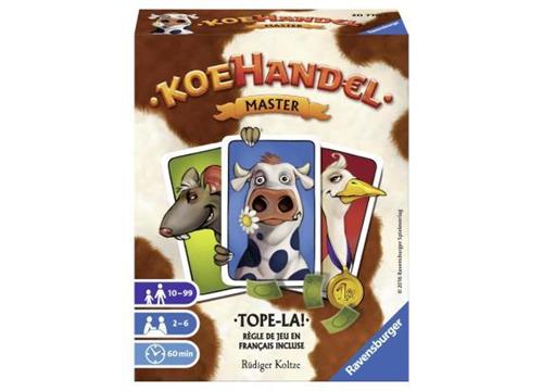 Er is reikhalzend naar uitgekeken maar nu is hij er dan toch: Koehandel Master! Van dit hilarische kaartspel zijn inmiddels alleen in Nederland al meer dan 750.000 stuks over de toonbank gegaan. Hoogste tijd dus voor een nieuwe uitdaging voor de vele enthousiaste liefhebbers! Voor de beginners blijft het "oude" koehandel het ideale instapspel. Koehandel Master onderscheidt zich door: Het aantal spelers: 2 tot 6 - Het grotere aantaal kaarten en dieren: 120 - De volwassen, trendy illustraties - De modulaire spelregels met verschillende veilingtechnieken Kortom, de liefhebber kan met Koehandel Master zijn hart ophalen!
