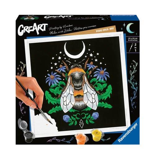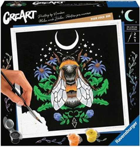 Schilder het kunstwerk CreArt Pixie Cold Edition Bee! Met deze schilderset van Ravensburger kunnen volwassenen zich vermaken met schilderen op nummer. De eenvoudige schildertechniek maakt het mogelijk om op een ontspannen manier het kunstenaarstalent in jezelf naar boven te halen. Met duidelijke schildervakjes en fijnere kleurnuanceringen ontstaat er een elegant kleurverloop en schaduwspel op een kunstwerk van 20 bij 20 centimeter.