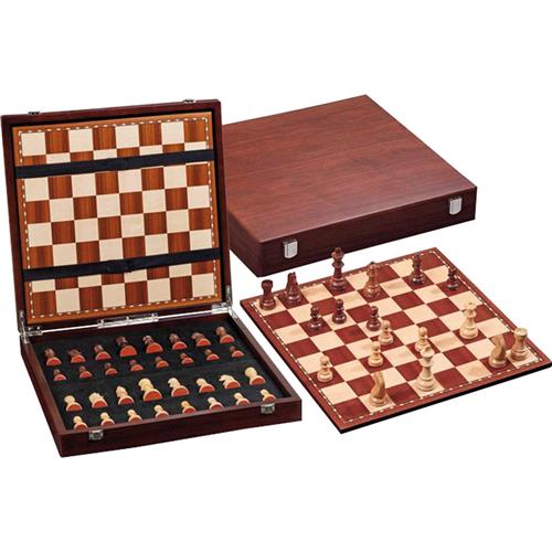De Schaak Box Exclusive van Philos is een prachtige schaakset met Staunton design schaakstukken gemaakt van sheesham en buxus hout, gecertificeerd volgens CITES richtlijnen. Deze schaakstukken zijn dubbel verzwaard en hebben een koningshoogte van 78 mm, met een lederen voet voor een luxe uitstraling. Het schaakbord, vervaardigd van esdoorn met sapele-optiek, heeft een mat afwerking en een veldgrootte van 45 mm, met een opvallend mooie sierrand. De bijbehorende schaakstukkendoos is ook inbegrepen, met 32 individuele compartimenten, en heeft een afmeting van 43x43x6,5 cm.