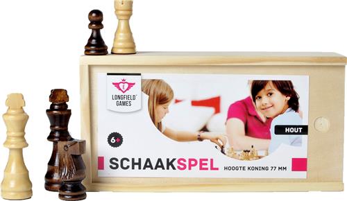 Inclusief een handig houten kistje van Essenhout om de schaakstukken in op te bergen. Het kistje bevat 32 schaakstukken in zwart/natuurlijke kleur, waarbij de koning een hoogte heeft van 77 mm. Het kistje heeft een schuifdeksel voor gemakkelijke toegang.