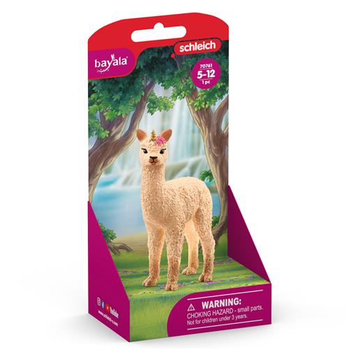 Ontdek de betoverende wereld van BAYALA® waar dit schattige lama-eenhoornveulen rondspringt, bedekt met sprankelende glitters. Haar hoeven en poten glinsteren onder de magische glitters, wat haar een betoverende uitstraling geeft. Ze pronkt met een prachtige bloem op haar hoofd en houdt ervan om zichzelf te versieren met kleurrijke bloemen. Dit kleine 'lamahoorn' brengt magie en vreugde in de wereld van schleich® BAYALA!