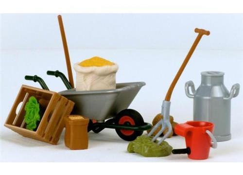 | Verpakkingsinhoud | 1x kruiwagen, 1x haverzak, 1x voederzak, 1x hooibaal, 1x hooivork, 1x bezem, 1x aardappel, 1x sla, 1x melkkan, 1x voerbak, 1x emmer voor kalfje |