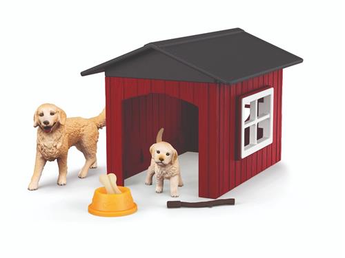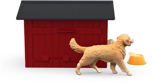 Op de boerderij vind je het gezellige Schleich hondenhok met de schattige Golden Retrievers. Het hondenhok is gemaakt van stevig kunststof en heeft een rood houten uitstraling met een antracietkleurig dak. De ramen aan de zijkant zorgen voor voldoende lichtinval, waardoor de honden comfortabel kunnen verblijven in hun knusse huisje.