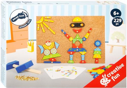 Kom naar dit geweldige hamerspel en geniet van het creatieve proces! Een kurkbord, twee hamertjes, 100 kleine spijkers en 126 kleurrijke houten delen staan klaar om een uniek beeld te vormen. Hier is ruimte voor onbeperkte fantasie. Of het nu robot, trein of raket is, alles is mogelijk. Voor wie op een idee wil komen, er worden zes verschillende voorbeelden bijgeleverd. Geniet van uren educatief plezier!