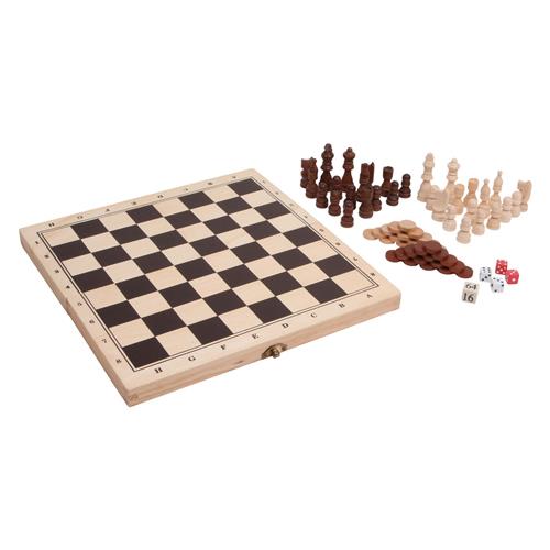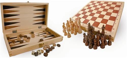 | Verpakkingsinhoud | Schaak-, dam en backgamon bord (3- in 1) Damschijfjes Schaakstukken Dobbelstenen voor backgamon |