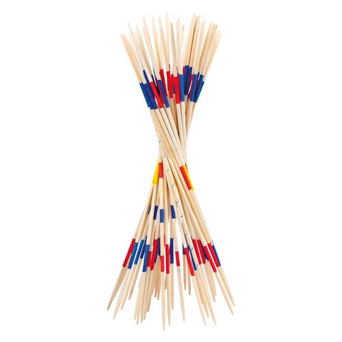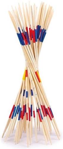 Deze 41 houten stokjes trainen de behendigheid van elke speler. De extra grote Mikado-stokjes zijn zowel binnen als buiten te gebruiken. Maar het is niet makkelijker om met de grote houten stokken te spelen dan met de kleintjes - alleen behendige en geduldige handen zullen slagen! Afmetingen: 50cm, Ø ca. 1 cm Adviesleeftijd: vanaf 4 jaar.