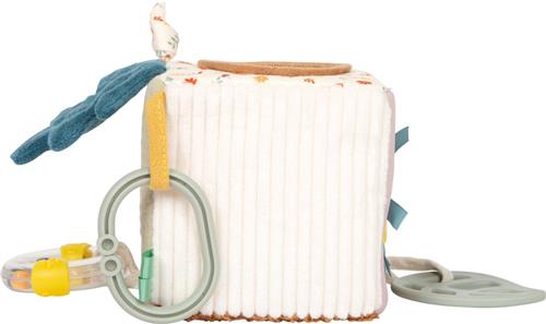 De verschillende stofstructuren prikkelen de tastzin, terwijl activiteiten zoals grijpen, drukken en draaien de fijne motoriek van je kindje bevorderen. De compacte en gewatteerde vorm van de kubus maakt deze extra knuffelbaar en veilig voor zelfs de jongste baby's, zodat ze zonder zorgen kunnen ontdekken.