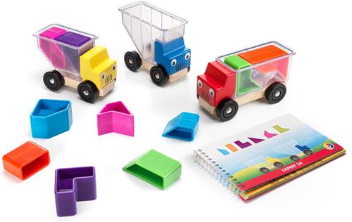 | Verpakkingsinhoud | 3 houten vrachtwagens met transparante laadbak, 10 kleurige blokken, boekje met 48 opdrachten en oplossingen, foldertje met spelregels |
