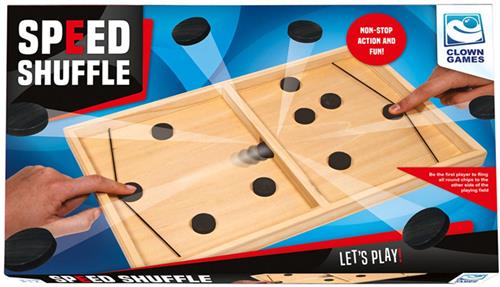 Maak je klaar om die ronde fiches af te vuren met non-stop actie en plezier! Zorg ervoor dat je het elastische koord gebruikt. Wees snel en precies en schiet alle pucks over het speelveld, zodat ze de andere kant bereiken. Het doel van het spel is om de eerste speler te zijn, die alle ronde fiches naar de andere kant van het speelveld heeft gespeeld. Speed Shuffle wordt geleverd met een houten speelveld van 40 x 25 x 2,5 cm en 10 fiches. Dit educatieve spel is geschikt voor twee spelers vanaf 8 jaar.
