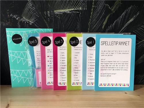 De inhoud van het pakket bestaat uit een speluitleg, 4 sets met 5 spelformulieren, een blad met hintskaartjes, en antwoordformulieren. De 5 spellen bieden een variatie aan activiteiten, zoals het Brabbelspel, Feit of Fabel, Op Wereldreis, Dierendag en Hints. Een garantie voor lachen en plezier!