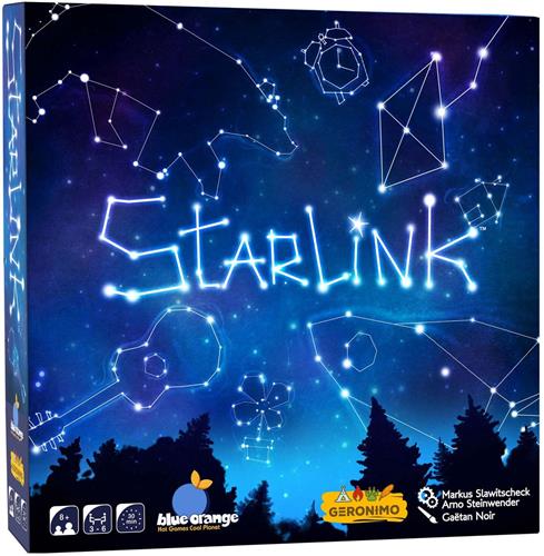 Raad jij wat er in de sterren staat getekend? Starlink is een tekenspel waarbij de actieve speler een woord tekent op het nachtelijk blauwe spelbord met een witte stift. Doordat je enkel rechte lijnen mag tekenen, wordt dit tekenwerk hilarisch lastig. Alle andere spelers proberen de tekening zo snel mogelijk te raden. Wanneer het juiste woord wordt gevonden, krijgen de tekenaar en wie het woord juist raadde punten. Wanneer iedereen eens de actieve speler is geweest, wint degene met de meeste punten. Starlink is niet alleen leuk, jullie persoonlijke sterrenhemel aan het einde van het spel ziet er ook nog eens fantastisch uit!