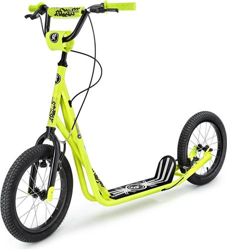 De Step Volwassenen Grote Wielen Hypermotion RUNKIE fiets heeft een opvallende gele kleur en een stoer ontwerp zonder specifiek personage. De luchtbanden, aluminium wielkern en 16-inch wielen zorgen voor een soepele en comfortabele rit, terwijl de Engelse handleiding ervoor zorgt dat je de step gemakkelijk kunt monteren en gebruiken. Met een verpakkingsgewicht van 7 kg en afmetingen van 107 cm x 59 cm x 16 cm (L x B x H) is deze step eenvoudig op te bergen en mee te nemen.