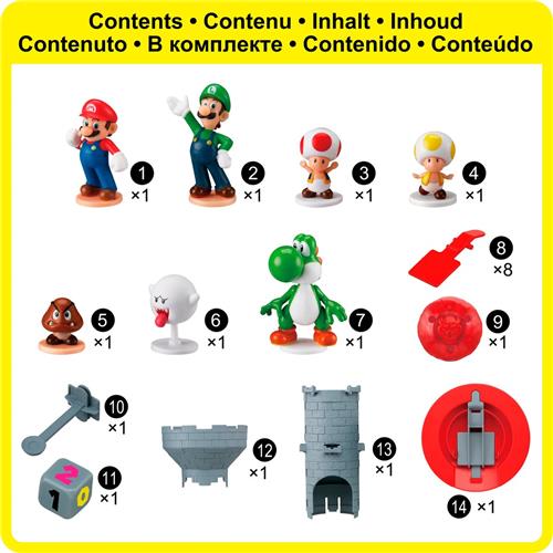 | Verpakkingsinhoud | 7 COLLECTIBLE FIGUREN SUPER MARIO, DOBBELSTEEN, TOREN , BAL |