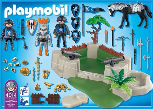 De blauwe ridders beschermen hun bastion en schat tegen de oranje-zilveren ridder. De schat zit verborgen in de rots naast het bastion. De kanonnen kunnen echt schieten.