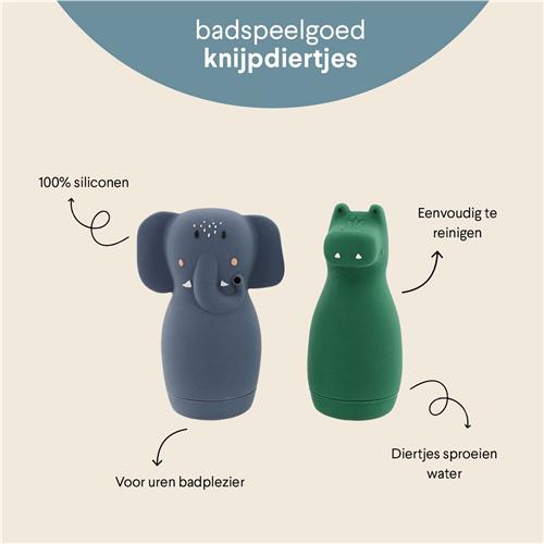 - Bij Bol.com kun je Trixie Knijpspeelgoed voor in bad Mrs. Elephant & Mr. Crocodile Siliconen Badspeelgoed Spuitfiguurtjes Vanaf 6 Maanden kopen voor de prijs van € 15,95. Dit is vandaag de goedkoopste webshop.