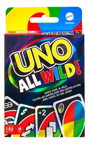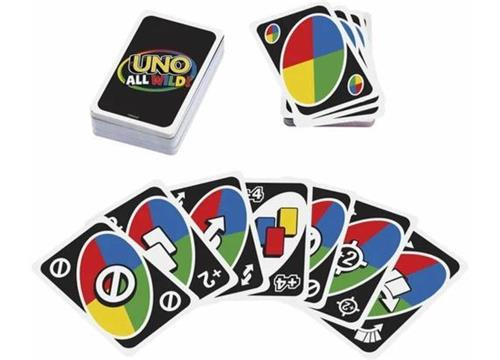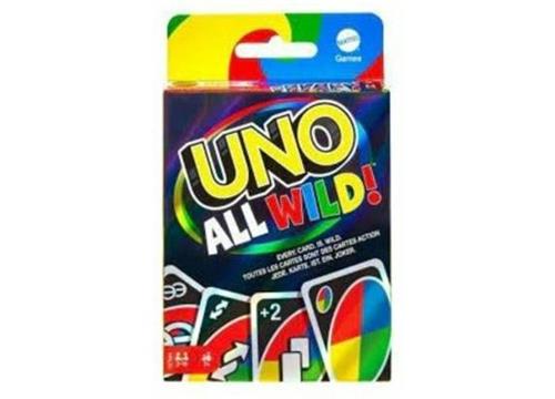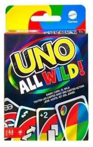 Uno All Wild speelt net als traditionele Uno, behalve dat elke kaart wild is. Dat betekent dat je in plaats van dat je de kleur en het nummer moet matchen, elke kaart kunt spelen die je wilt. Het doel is hetzelfde: wees de eerste speler die al je kaarten kwijt is. Geschikt voor kinderen vanaf 7 jaar.