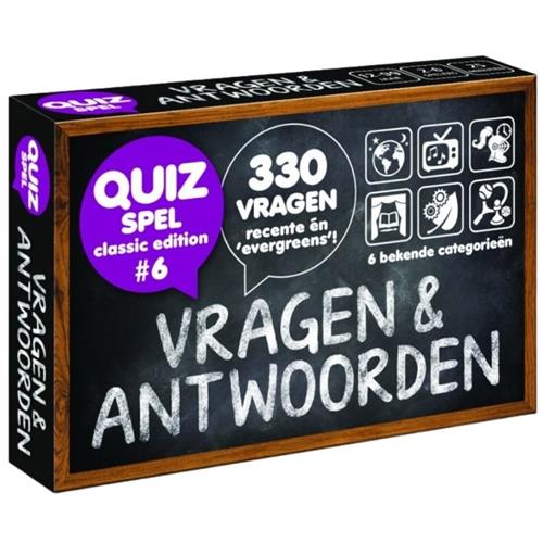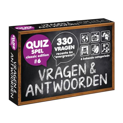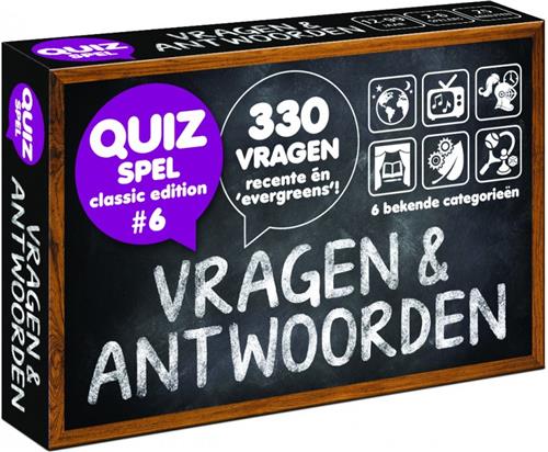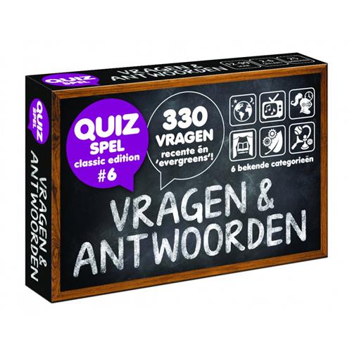 Dit pocketformaat quizspel kan zowel als aanvulset bij de bekendste quizspellen maar ook als spel op zich gebruikt worden. Deze 6e editie van Trivia Vragen Antwoorden brengt weer 330 nieuwe vragen. Vragen over vroeger en over recente gebeurtenissen. Vragen & Antwoorden - Classic Edition #6 is een pocketformaat (brievenbuspost!) quiz spel (voor 2-6 spelers vanaf 12 jaar) dat zowel als aanvulset / uitbreiding bij andere trivia spellen maar ook als quiz spel op zich gebruikt kan worden. Het spel bevat 55 kaartjes met totaal 330 vragen... zéér recent afgewisseld met 'evergreens'! De vragen (gemaakt door Marian van Eupen; dé quizvragenmaker van Nederland!) komen uit de 6 bekende categorieën, gemakkelijk herkenbaar aan de icoontjes. Vragen & Antwoorden... hét quizspel van dit moment! Niet in de laatste plaats omdat ze makkelijk tijdens videobellen gespeeld kunnen worden! Het past in iedere broekzak en je kunt het spelen waar jij maar wilt (ook via videobellen!). Er bestaan inmiddels alweer 14 edities! Het trivia spel heeft geen ingewikkeld spelmechanisme. Je gaat gewoon lekker elkaars kennis testen.