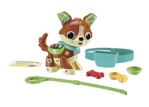 | Verpakkingsinhoud | 1x VTech Waffie de Wandelpuppy, 1x Hondenriem onderdeel A, 1x Hondenriem onderdeel B, 1x heuptasje, 1x stoffen riem, 1x kluif, 1x voerbak, 1x waterflesje, 1x puppy paspoort, 1x handleiding, 1x stickervel |