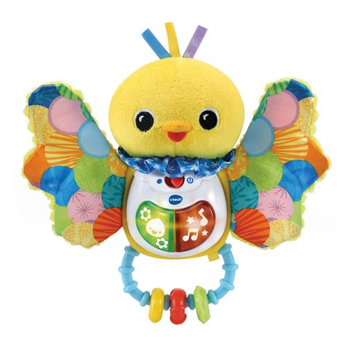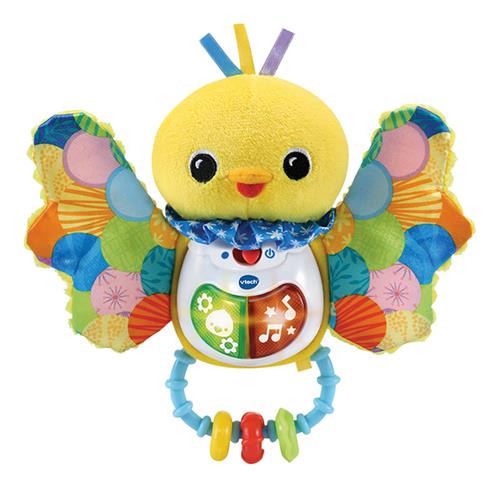 VTech Baby Fladder & Fluit RammelaarDe Fladder & Fluit Rammelaar is een vrolijk en kleurrijk vogeltje dat verschillende texturen bevat en de tastzin van kleintjes stimuleert. De twee knipperende toetsen activeren vrolijke zinnetjes, grappige geluiden en muziek en laten kleintjes kennismaken met eenvoudige vogelweetjes. Schud het vogeltje om grappige geluiden te horen en verwijder het elektronische onderdeel om het vogeltje te wassen in een wasmachine.