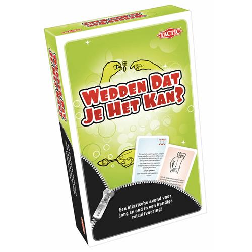 Wedden Dat Je Het Kan is een schaterlachend spel voor jong en oud. Kun jij je schoenen wisselen en binnen 10 seconden rond de tafel rennen? De andere spelers wedden of jij dat kan. Dat is... Wedden dat je het kan! Soms krijg je een vraag, soms moet je een opdracht uitvoeren en wed je op de andere spelers. Wedden dat jullie een lachen-gieren-brullen avond hebben? Dit is de handige reisuitvoering van het grote spel vol met nieuwe vragen en hilarische opdrachten! Bestel het Tactic Wedden Dat Je Het Kan Reisspel nu en beleef overal plezier met dit uitdagende en vermakelijke spel!
