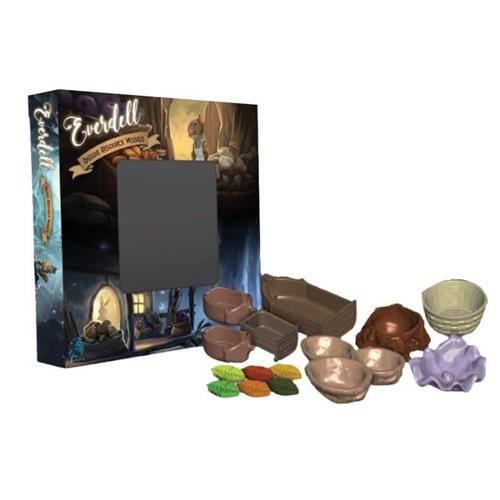 Bewaar en toon je Everdell grondstoffen in deze prachtige grondstofbakjes! De set bevat 2 eikels voor bezette tokens, 1 mandje voor bessen, 6 plastic bladeren voor gebeurtenistegels, 1 plastic mijnkar voor kiezelstenen, 1 plastic schelp voor parels, 1 plastic boomstronk voor hars, 1 plastic takkenboot voor takken en 3 plastic walnoten voor puntfiches.
