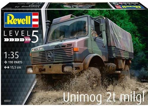 Ontdek de 1:35 Revell 03337 Unimog 2T milgl Plastic Modelbouwpakket, een schaalmodel van het militaire voertuig dat is aangepast aan de militaire eisen en uiterst efficiënt off-road is. Dit modelbouwpakket bevat alle details die het voertuig kenmerken, inclusief een gedetailleerde bestuurderscabine en een platform met dekzeil.