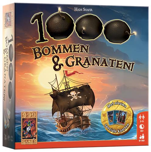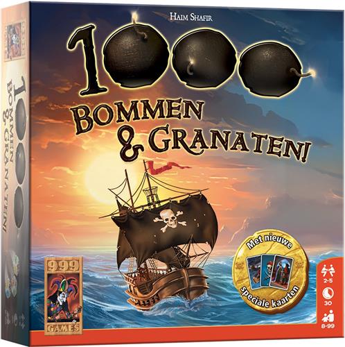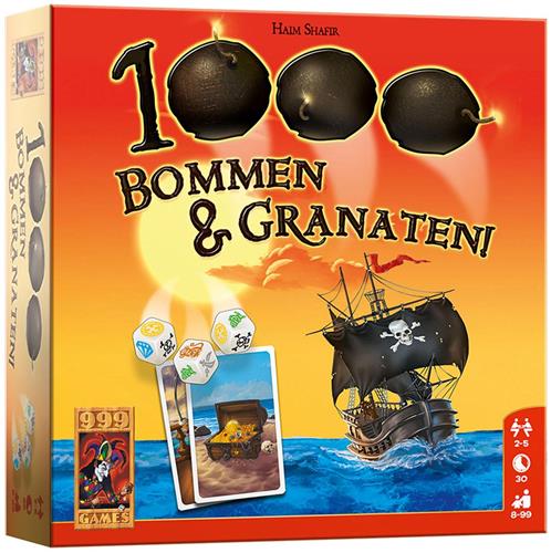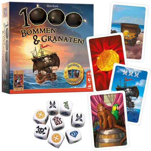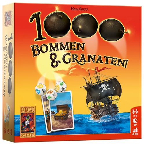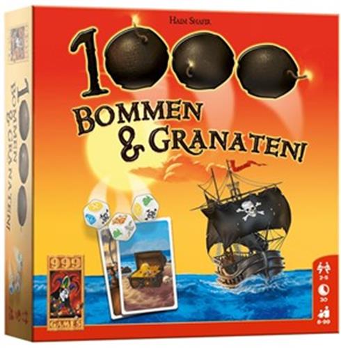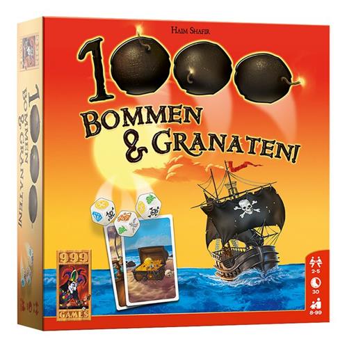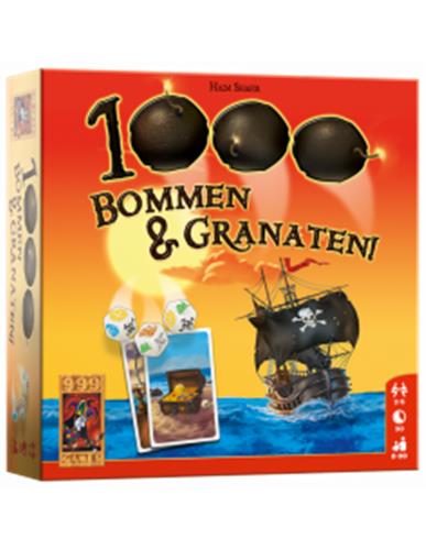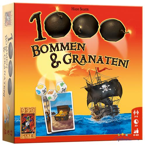 1000 Bommen & Granaten! is een eenvoudig dobbelspel met piratenthema, waarin je met 8 dobbelstenen zoveel mogelijk gelijke symbolen probeert te dobbelen. Je mag zo vaak opnieuw dobbelen als je wilt, maar schedels moet je opzij leggen. Gooi je een derde schedel, dan is je beurt direct voorbij en scoor je geen punten. Een piratenkaart geeft je mogelijkheden en beperkingen in je beurt aan. Hoe meer gelijke symbolen je gooit, hoe meer punten je scoort. Daarbij ontvang je nog extra punten voor goud en diamanten. Scoren al je dobbelstenen, dan krijg je nog een extra bonus. Gooi je met je eerste worp 4 of meer schedels, dan bezorg je de andere spelers minpunten. Wie als eerste een bepaald aantal punten heeft bereikt, wint het spel. Het spel duurt gemiddeld 30 minuten en is geschikt voor kinderen en volwassenen vanaf 8 jaar. Het bevat 8 dobbelstenen, 35 piratenkaarten, 5 overzichtskaarten en de spelregels.