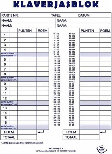 | Verpakkingsinhoud | 1x haza - Klaverjasblok - Scoreblok voor klaverjassen |