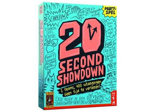 20 Second Showdown is een vliegensvlug partyspel voor 5-20 spelers. Eén speler is de scheidsrechter. De anderen verdelen zich over twee teams, gaan tegenover elkaar zitten en zetten zich schrap. Aan het begin van elke ronde zet de scheidsrechter de zandloper terug met een gelijkmatige hoeveelheid zand in elke helft. De scheidsrechter draait de zandloper om en leest de kaart voor. Elke kaart bevat 2 uitdagingen en de scheidsrechter bepaalt welke kant in een ronde wordt gebruikt. "Sta op en doe de YMCA. Stel jezelf netjes voor zonder je mond dicht te doen. Noem drie landen die beginnen met de letter B. Gebruik je eigen sok als handpop. Noem alle dingen op die je vandaag hebt gegeten". Bij iedere behaalde uitdaging draait de scheidsrechter de zandloper om. Om te winnen, moet je het andere team dwingen om zonder zand te zitten door je uitdagingen zo snel mogelijk af te ronden. Het eerste team dat zonder zand komt te zitten, verliest de ronde en het eerste team dat drie ronden wint, wordt gekroond tot kampioen!