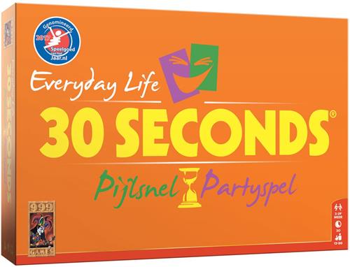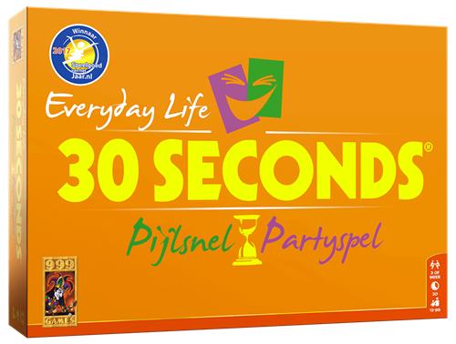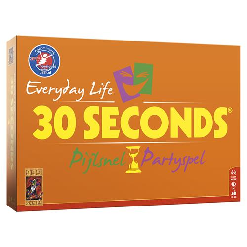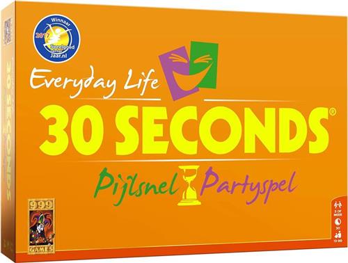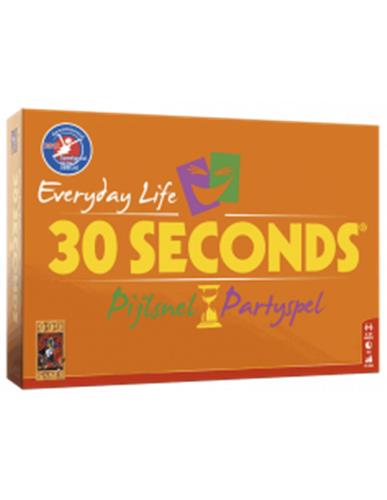 30 Seconds Everyday Life is de opvolger van het bordspel 30 seconds. 30 Seconds is een partyspel voor teams waarbij je iedere beurt 30 seconden de tijd hebt om 5 begrippen te omschrijven, zonder het woord te zeggen. Als je 30 seconds speelt, heb je altijd een leuke avond. Als je het spel 30 Seconds - Everyday Life gaat spelen, dan moet je eerst 2 teams vormen. Als jouw team aan de beurt is, dan moet je jouw teamgenoot (of jouw teamgenoot jou) 5 begrippen laten raden binnen 30 seconden, zonder die 5 woorden te noemen. Soms is 1 woord al voldoende om het raden, maar de meeste mensen struikelen over hun tong. Probeer samen zo veel mogelijk begrippen duidelijk te maken en te raden. Het gebeurt niet vaak, maar het is mogelijk om ze alle 5 goed te hebben. Het aantal goede antwoorden zijn de aantal plekken dat je vooruit mag op het bord. Voorafgaan aan je beurt moet je eerst met een dobbelsteen gooien. Die kan nog roet in het eten gooien voor de aantal stappen dat je vooruit mag zetten. Gooi je 0, dan mag je voor ieder geraden woord een plek vooruit. Gooi je 1 of 2, dan moet je die van het totaal aantal goede antwoorden aftrekken. Bereikt je samen met jouw teamgenoot als eerste de finish, dan heb je het spelletje 30 seconds gewonnen.