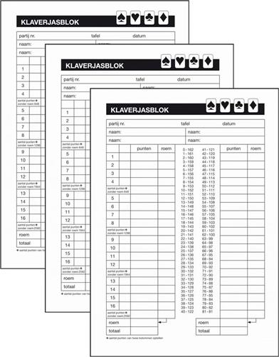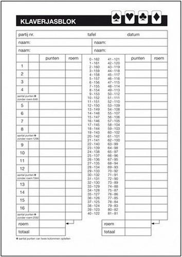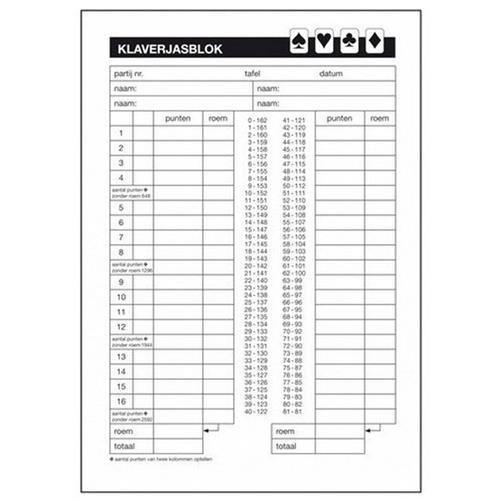 - Bij Bol.com kun je 3x Kaartspel Klaverjassen scoreblok 50 vellen A5 kopen voor de prijs van € 13,25. Dit is vandaag de goedkoopste webshop.