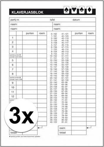 - De goedkoopste webshop om 3x Kaartspel Klaverjassen scoreblok 50 vellen A5 te kopen is voor het laatst gecontroleerd op woensdag 17 december 2025.