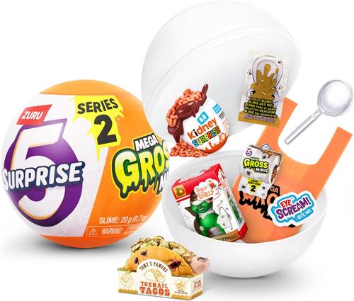In elke bal van de 5 Surprise Mega Gross Minis Serie 2 vind je 5 brute verrassingen. Open de crispy bal om 3 Mega Gross Minis, een zakje slijm, een sticker en een verzamelgids te ontdekken. Ga op zoek naar de zeldzame Real Liquid, Toxic-Glow of Stinky Mega Gross Minis en breid je collectie uit met de meer dan 40 unieke Minis uit Serie 2. Deze ZURU Mega Gross Mini speeltjes nemen de bekende producten op de hak en zorgen voor flink wat gniffelplezier!