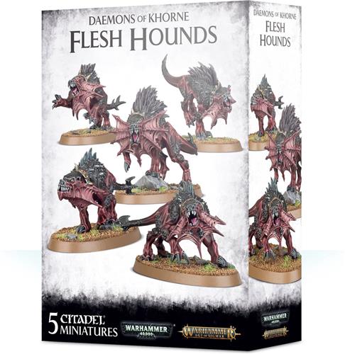 De Flesh Hounds zijn snel, dodelijk en vooral effectief in het doden van degenen die zich durven te bemoeien met tovenarij. Ze zijn bruikbaar in zowel Warhammer 40.000 als Warhammer Age of Sigmar en zijn uitstekend om de favoriete personages van je tegenstanders te doden of dodelijke flankerende aanvallen uit te voeren. Deze set bevat alles wat je nodig hebt om vijf Flesh Hounds te bouwen. Elk van hen is bewapend met bloed-donkere klauwen en draagt een halsband van Khorne. De set bestaat uit 20 plastic onderdelen en wordt geleverd met 5 x 60mm ovale bases.