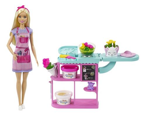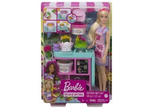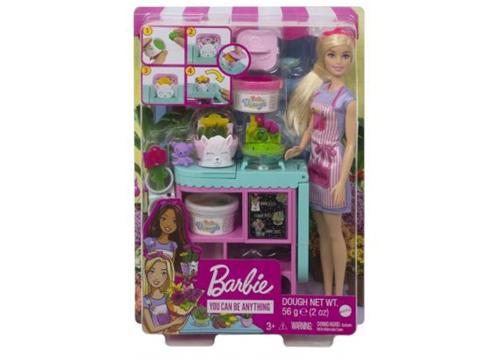 Met de Barbie Bloemist speelset kunnen kinderen hun eigen bloemenwinkel runnen! De set bevat Barbie de bloemist pop, een werkbank voor het maken van boeketten en bloemstukken, 3 kleuren klei, 2 vazen, een vorm, schoonmaakgereedschap en een schattige teddybeer. Barbie de bloemist, gekleed in een trendy gestreept schort met gereedschapszak, staat klaar om prachtige bloemcreaties te maken met behulp van klei en haar magische bloemenmachine.