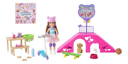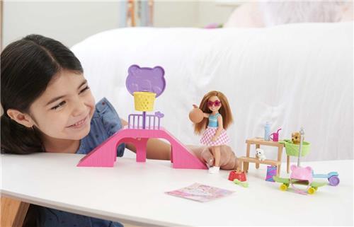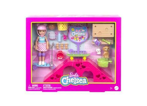De Barbie Chelsea met puppies is een schattige Barbiepop die wordt geleverd met een scala aan accessoires. In de doos vind je niet alleen de Chelsea pop met een verwisselbaar rokje en accessoires zoals schoenen, een helm en beschermers voor ellebogen en knieën, maar ook twee schattige puppy's. Daarnaast bevat de set ook een skateramp, een basketbalring met basketbal, een picknicktafel, een bankje en een puppystoeltje, een step en een skateboard, samen met nog negen andere accessoires en een stickervel. Let op, de pop kan niet zelfstandig staan en de kleuren en versieringen kunnen variëren.