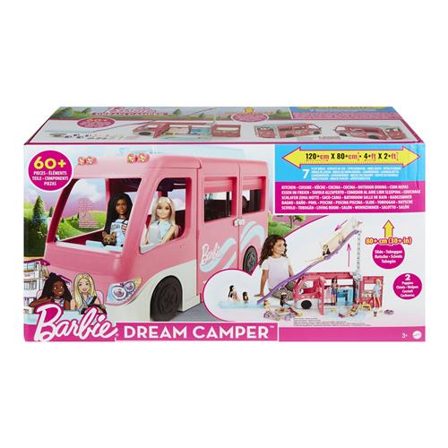 Maak een geweldige reis in de Barbie Dreamcamper. Deze camper van Barbie heeft zeven speelplekken, een geweldige glijbaan en talloze verhalende accessoires die je laat dromen van eindeloze avonturen in de buitenlucht. Laat Barbie en haar vrienden de trap beklimmen en duw ze over de glijbaan naar beneden het zwembad in om een grote plons te maken. Geef de reis van Barbie een eigen tintje met de campingbumperstickers en speel eindeloos met de meer dan 60 accessoires, waaronder 2 puppy's. Wanneer iedereen weer klaar is voor het volgende avontuur, pak je alles in, sluit je de camper af en ga je weer op pad.