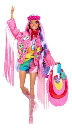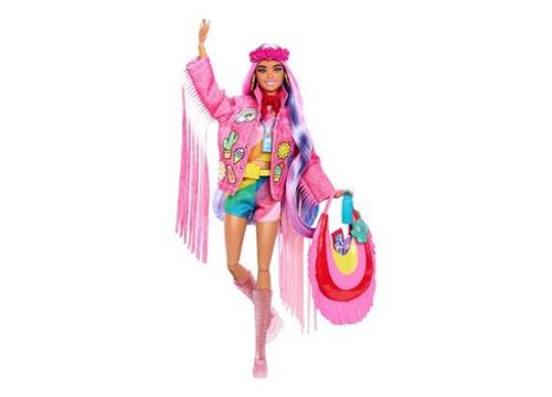 Barbie is helemaal klaar voor de woestijn met haar festivaloutfit. Ze toont haar zelfverzekerde stijl met lange roze en paarse lokken en een roze denim jack versierd met franje en kleurrijke lappen. De bijpassende set met regenboogstrepen en stijlvolle roze laarzen maken haar look compleet. Deze pop is een echte blikvanger en zal zeker de aandacht trekken!