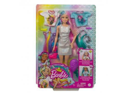 Barbie's lange blonde haar met roze, blauwe en glinsterende lokken wordt nog levendiger met de vrolijk gekleurde haarextensies aan de kroon. Met elastiekjes en haarklemmen kun je Barbies haar stylen en haar look compleet maken. Om haar sportieve kant te laten zien, trekt Barbie haar sneakers aan voor een nieuw avontuur.