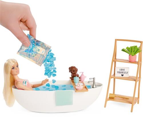 Met deze set ontvangt je een buigbare Barbie pop die op maar liefst zeven punten kan bewegen. Barbie heeft steil blond haar en draagt een trendy bikini met een doorschijnende sarong. De inbegrepen accesoires, zoals een ligbad, handdoek, lotion en zelfs een schattige puppy, stimuleren de fantasie van kinderen om hun eigen wellness-verhalen te creëren.