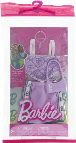Met deze prachtige Barbie kleding outfit en accessoires kan je Barbie pop in stijl gekleed worden. De set bestaat uit een paarse rok met bijpassende paarse top, een handtas en een ketting. Perfect voor kinderen vanaf 3 jaar die graag de kleding van hun Barbie pop willen veranderen. Het materiaal van de outfit is polyester en het is niet wasbaar. Het personage dat bij deze kledingset hoort is Barbie. De outfit is geschikt voor alle leeftijden en speciaal ontworpen voor modepoppen.