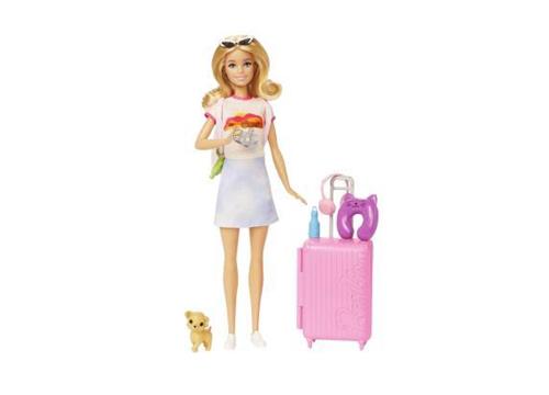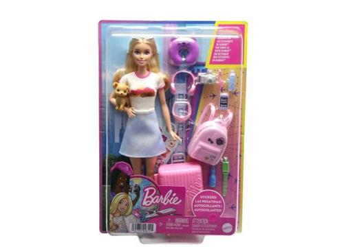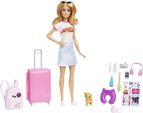 | Verpakkingsinhoud | Inhoud: 1 Barbie pop in top, rok en schoenen, 1 puppy, 1 koffer, 1 rugzak, 1 zonnebril, 1 camera, 1 telefoon, 1 waterfles, 1 tandenborstel, 1 tube tandpasta, 1 gezichtsmasker, 1 reiskussen, 1 flesje ontsmettingsmiddel, 1 hoofdtelefoon en 1 stickervel. Pop kan niet los staan. Kleuren en versieringen kunnen variëren. |