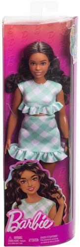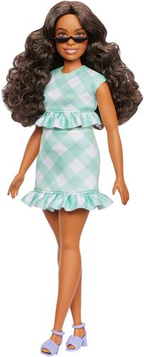 Deze Barbie beschikt over prachtige rondingen en golvend donkerbruin haar. Haar stijlvolle mintgroene geruite jurkje, versierd met grappige ruches aan de taille en zoom, zorgt voor een speelse uitstraling. De lavenderkleurige hoge hakken geven haar outfit een extra sprankje flair. Met haar zonnebril met half montuur is ze helemaal klaar om te schitteren, of het nu gaat om een picknick in het park of een leuk dagje uit met vrienden!