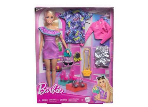 De inbegrepen Barbie-pop heeft een tenger lichaamstype en lang blond haar. Ze draagt een schitterende paarse jurk met lovertjes en een asymmetrische halslijn, maar dat is nog niet alles! Andere kledingopties zijn een T-shirtjurk met een opvallende print, een korte roze blazer en een metallic zilveren rok met ruches. Combineer deze outfits naar hartenlust met kleurrijke accessoires voor een unieke stijl!