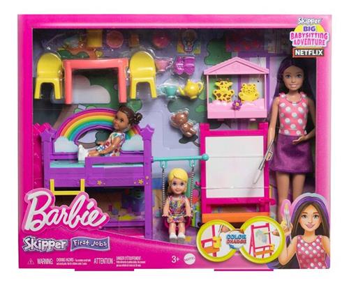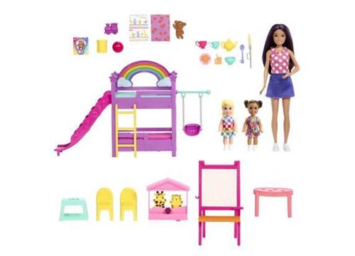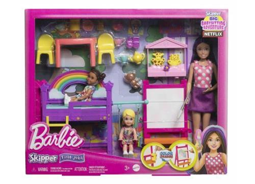 Met de Barbie Skipper Eerste Baantjes speelset kunnen kinderen de werkende wereld verkennen met Skipper, het tienerzusje van Barbie. Geïnspireerd op de film Skipper and the Big Babysitting Adventure, bevat deze set een Skipper pop als verzorger, twee kleine peuterpoppen, meubels en meer dan 15 accessoires voor de dagopvang. Laat de kinderen hun fantasie de vrije loop laten gaan met activiteiten als schilderen, thee drinken, poppenkast spelen, schommelen en glijden van de glijbaan.