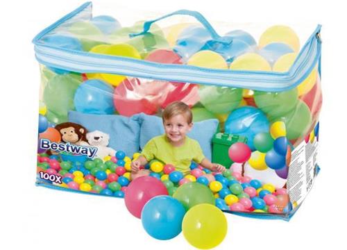 De verpakking van de Bestway ballenbakballen is CE gemarkeerd en bevat 100 stuks. De afmetingen van de verpakking zijn 30.80 cm x 25.10 cm x 43.30 cm en het totale gewicht is 0.92 kg. Het speelgoed is veilig voor gebruik, maar biedt geen bescherming.
